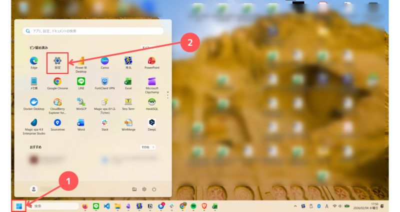 - スタートメニューから「歯車アイコン(設定)」をクリック