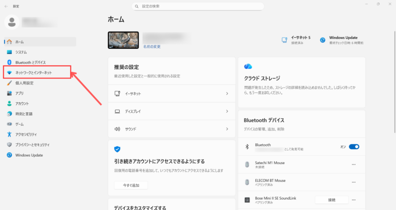 設定画面の左側メニューから「ネットワークとインターネット」を選択します。