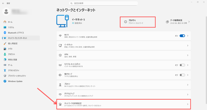 - 接続中のネットワーク(Wi-Fiまたはイーサネット)のプロパティが「プライベート」になっていることを確認