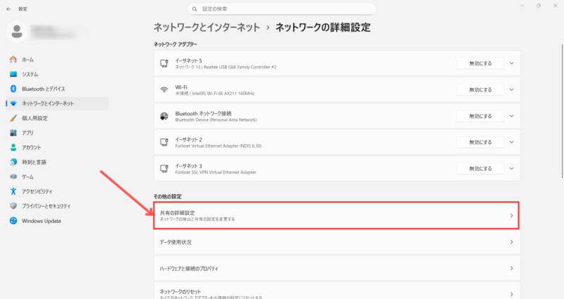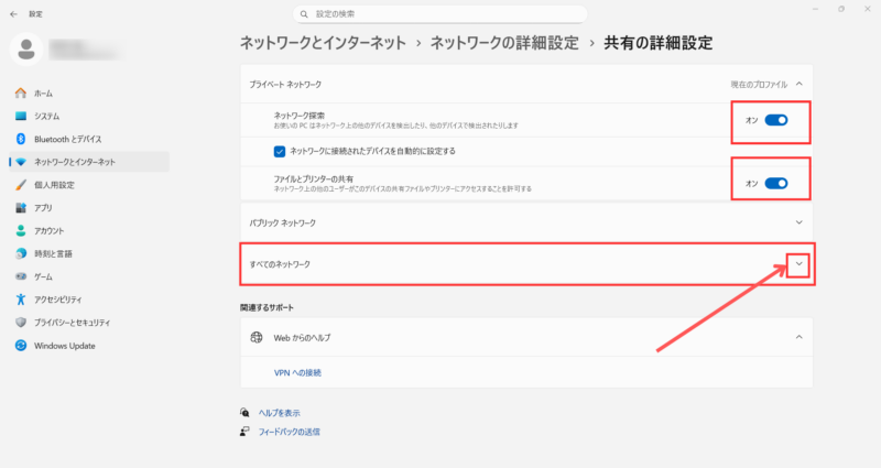 この設定を行うには、ネットワークプロファイルが「プライベートネットワーク」に設定されている必要があります。パブリックネットワークでは設定できませんのでご注意ください。