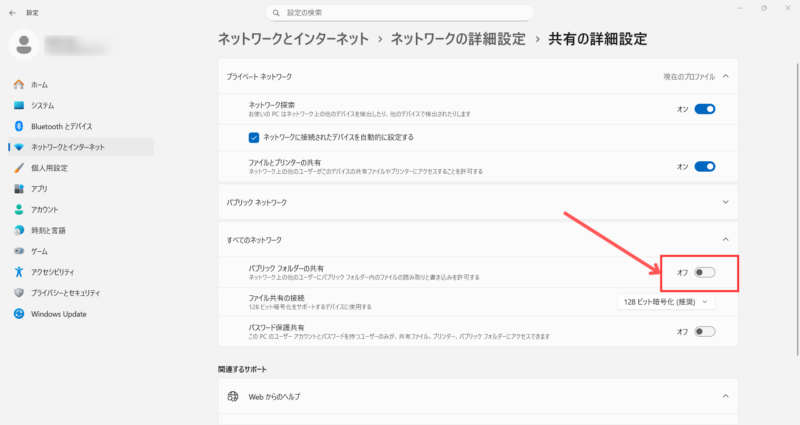 最後に、「パスワード保護共有を無効にする」を「オフ」して、画面を閉じれば終了です。